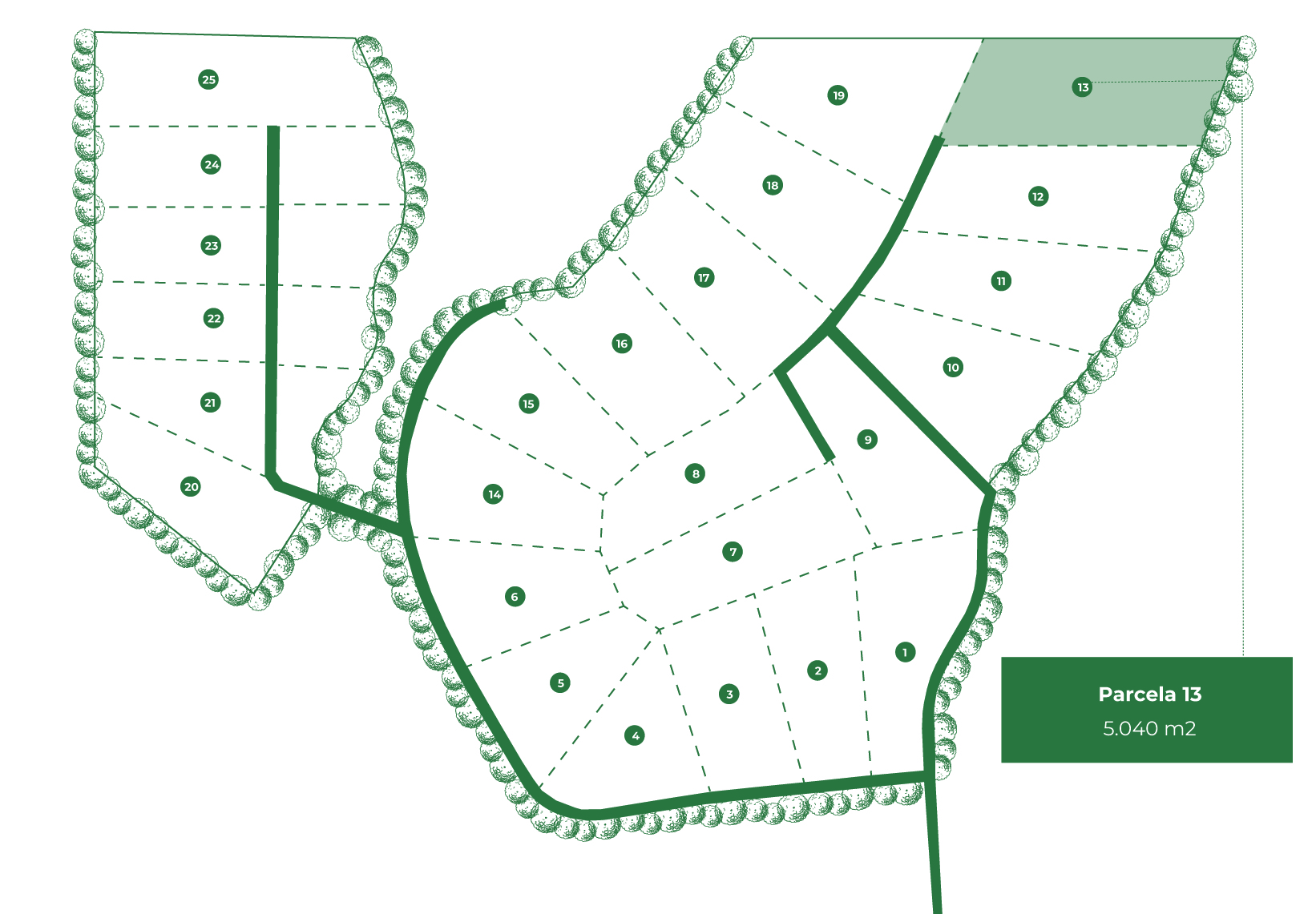 Parcela 13 – 5.040 m² de superficie con lomaje suave, con vistas hacia el bosque y valle de la Unión. Ubicada en la parte posterior de este proyecto, con un acceso posible a la parcela. Ideal para personas que estén buscando tener un terreno con bosque y despejada, con una vistas privilegiadas.